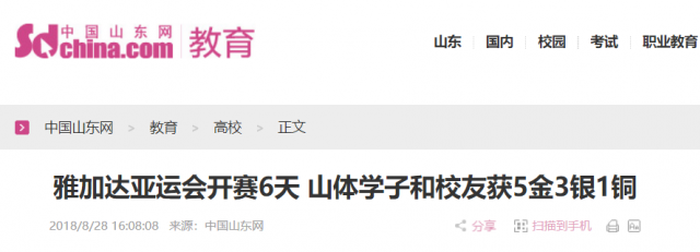截至8月24日,山东体育学院学子和校友在雅加达亚运会上共获5枚金牌、3枚银牌、1枚铜牌。