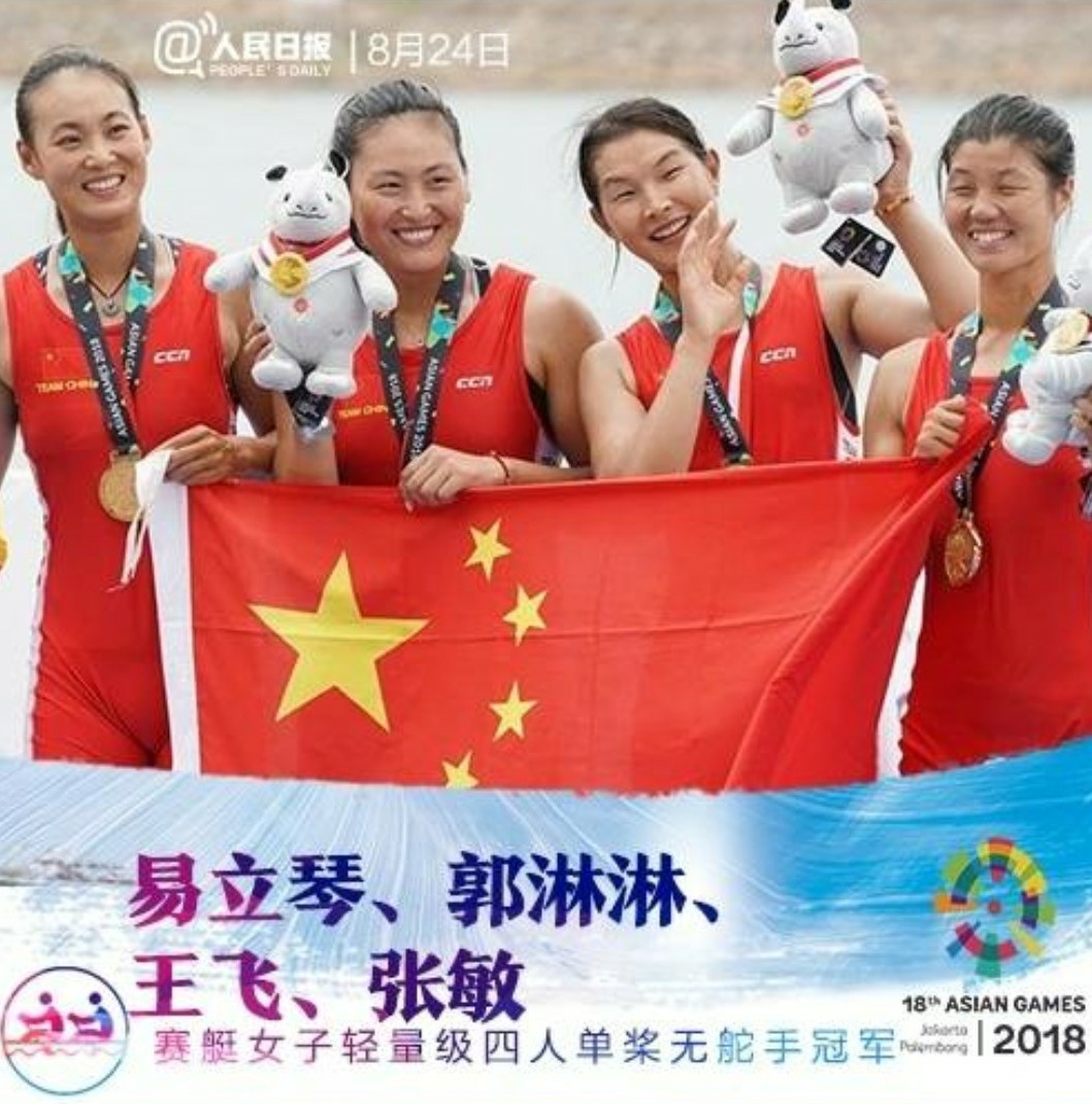 张敏、郭淋淋和队友荣获赛艇女子四人单桨金牌;