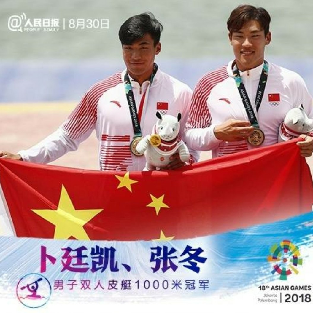 张冬、卜廷凯荣获皮划艇静水男子双人皮艇1000米金牌;