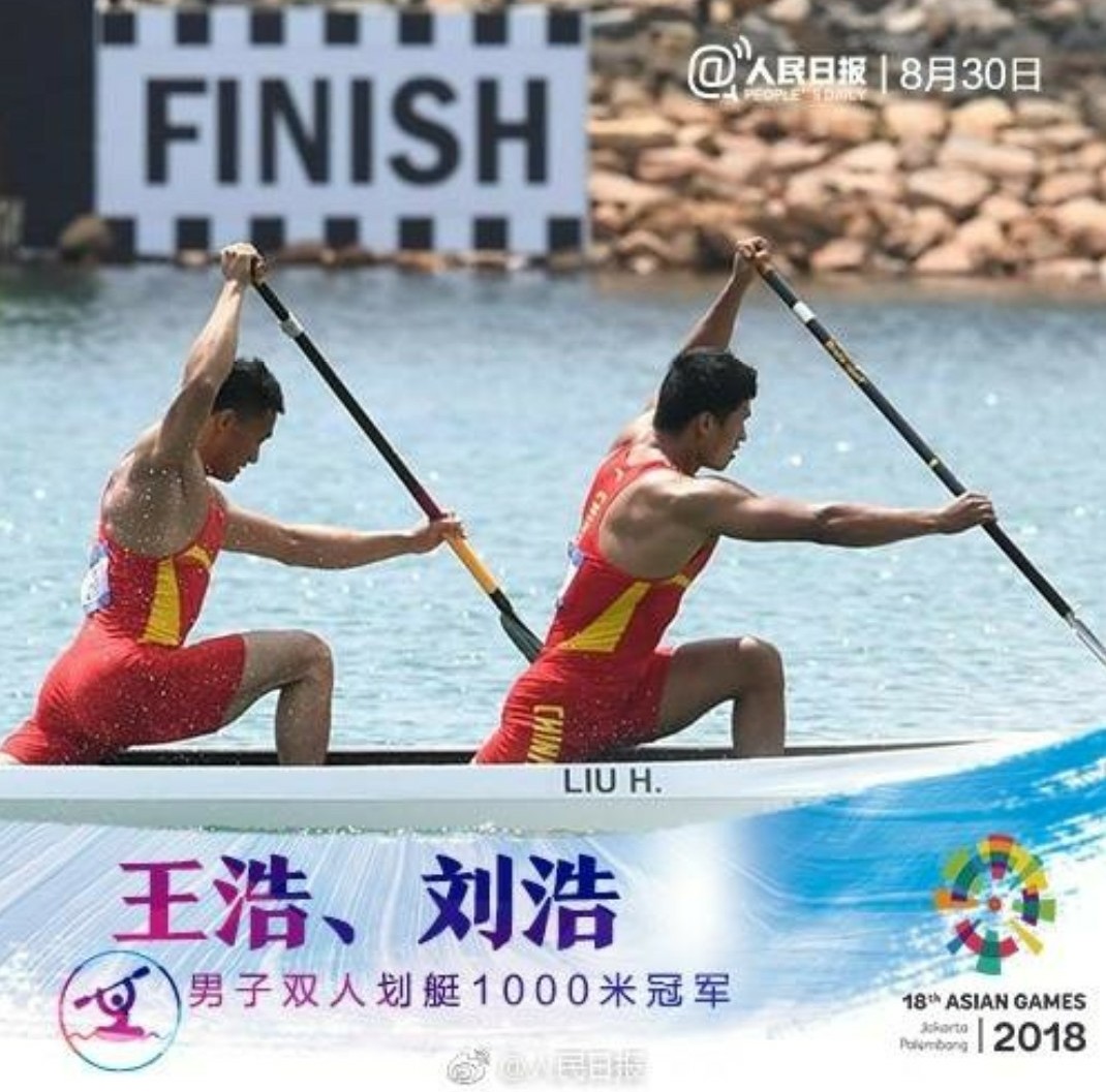 王浩和队友荣获皮划艇静水男子双人划艇1000米金牌;