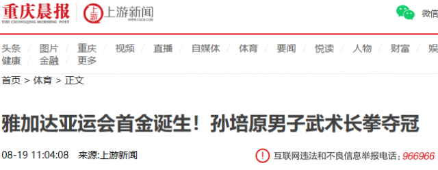 北京时间8月19日上午10时,在2018年雅加达亚运会男子武术长拳项目上,中国选手孙培原以9.75分排名第一,拿到了本届亚运会的首枚金牌,自2002年釜山亚运会以来,中国体育代表团已经连续五届夺取首金,这也是继武术从1990年成为亚运会正式比赛以来,中国选手获得的第七枚男子长拳金牌。